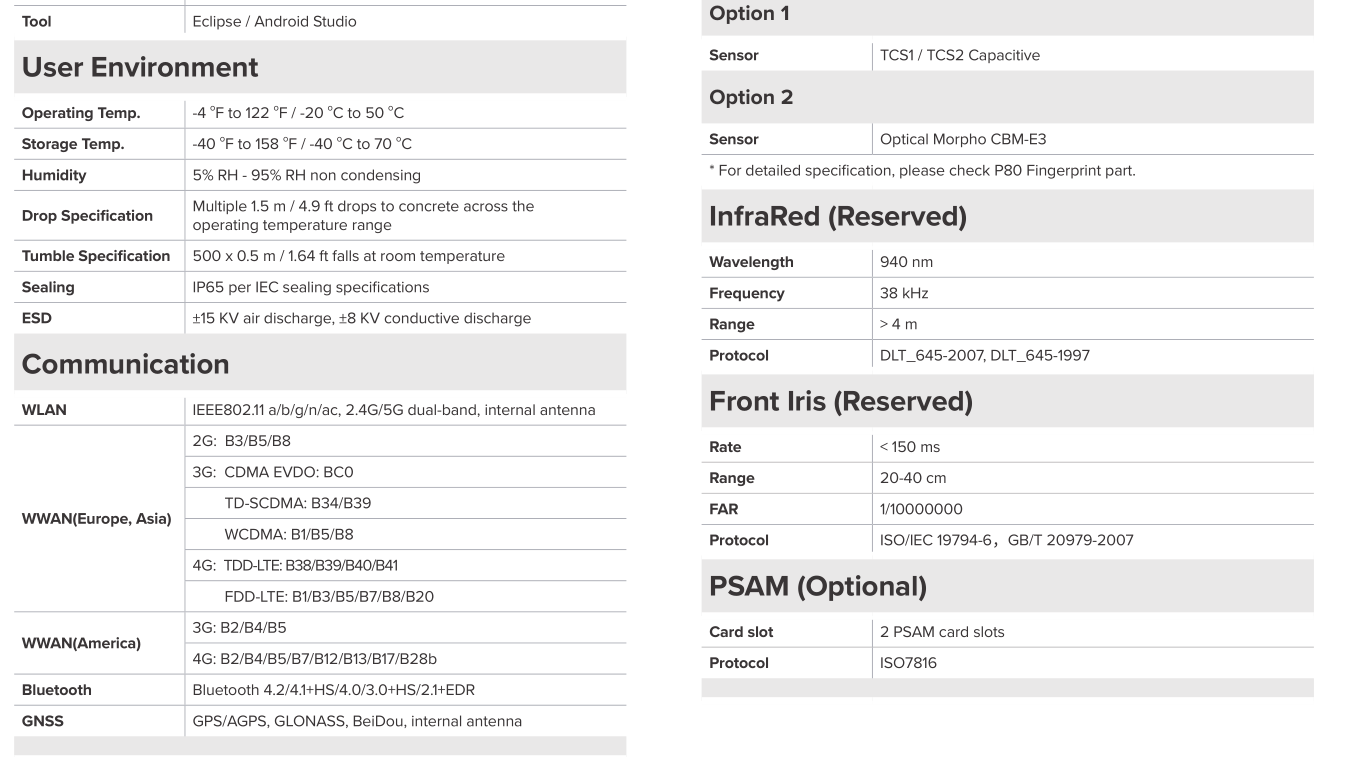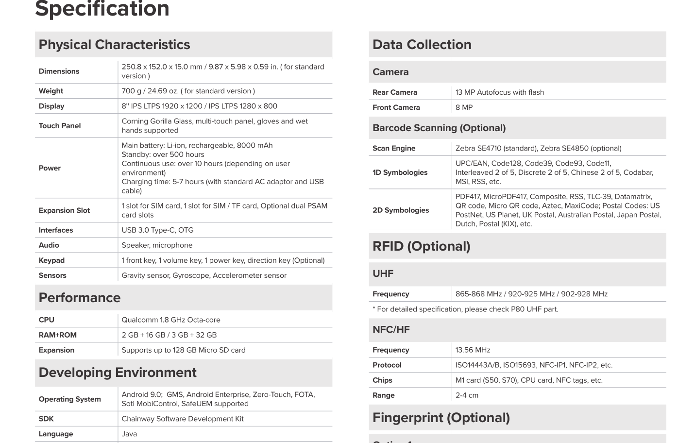 หน้าจอ แบตเตอรี่ 8000 mAh และตัวเลือกการจับข้อมูลที่ครอบคลุม เช่น UHF RFID การสแกนบาร์โค้ด HF RFID/NFC ม่านตา